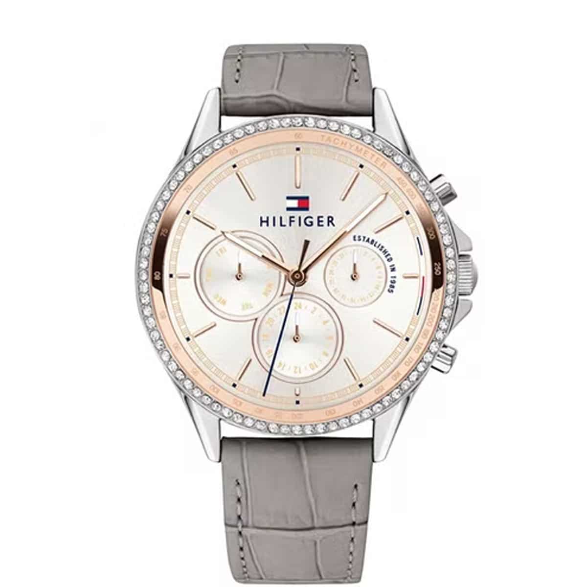 ساعة تومي هيلفيغر Tommy Hilfiger للنساء أصلية موديل (اري) 1781980 Ari بلون ابيض و استيك معدن جلد طبيعي لون رمادي