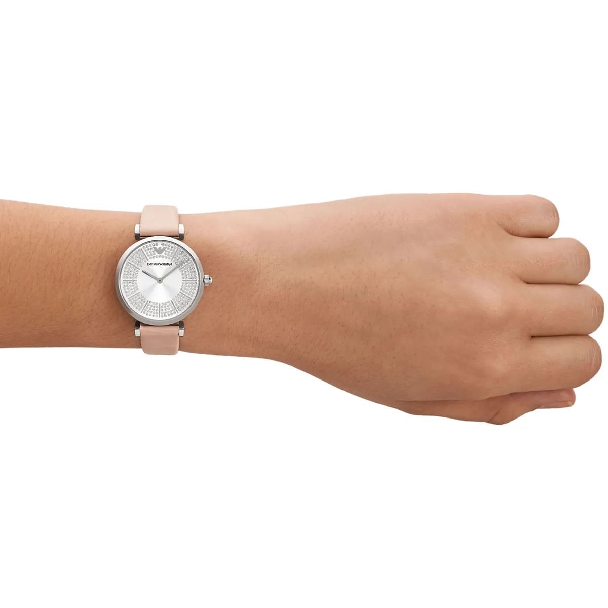 ساعة امبوريو ارماني Emporio Armani للنساء أصلية موديل AR11543 Gianni T-Bar لون فضي و استيك جلد طبيعي لون وردي.